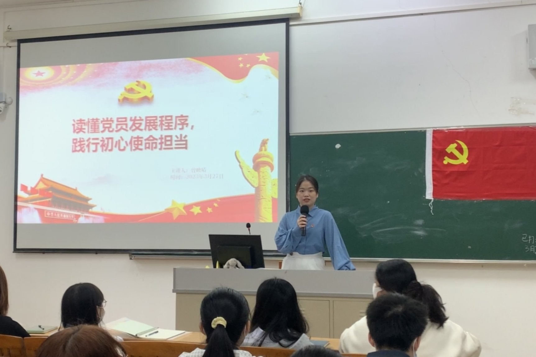 曾映晴以“读懂党员发展程序,践行初⼼使命担当”为主题,从申请⼊党、⼊党积极分⼦确定和培养教育、发展对象的确定和考察、预备党员的接收、预备党员的教育和转正“五个阶段二十五个步骤”进行授课。她讲到本次党课是同学们大学生生涯中的一件政治大事,可以使同学们的思想认识和追求进入一个新的起点,明确党员的条件,掌握党员义务和权利的内容,了解和熟悉发展党员的程序,为早日加入党组织并成为合格党员奠定良好基础。
