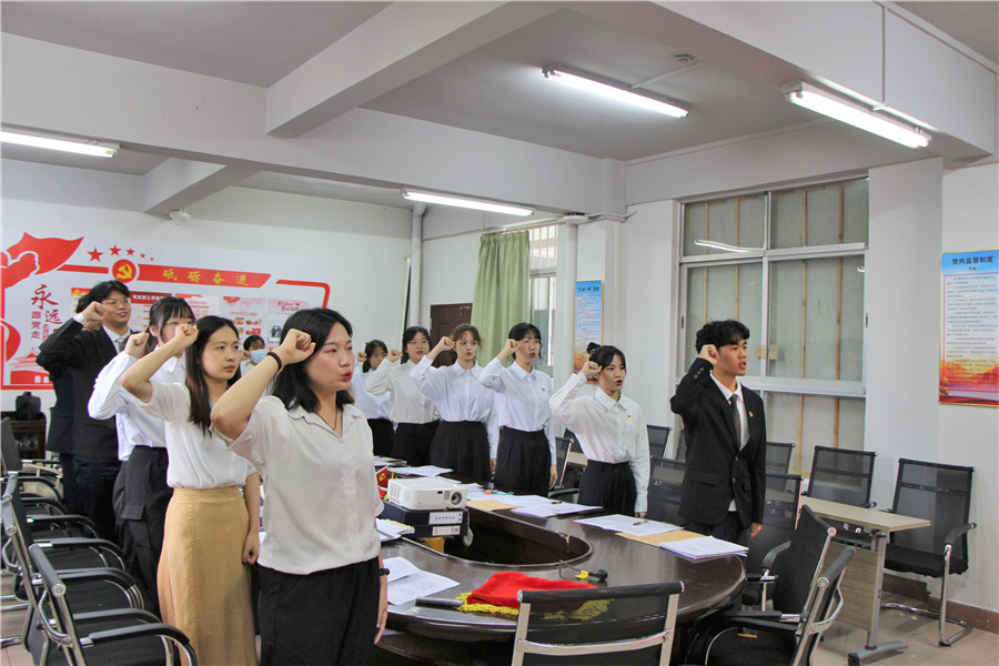 会议伊始,全体与会人员奏唱国歌,随后高平治等6名发展对象分别从入党动机、思想认识、表现情况以及个人总结与展望等方面进行详细的汇报。入党第一、第二介绍人介绍发展对象的主要情况并对其能否转为预备党员表明意见,经党支部大会讨论投票表决,同意高平治等6名同志发展为中共预备党员。 紧接着蓝喜带领参会同志重温入党誓词,全体党员面向党旗,庄严宣誓,并为预备党员授予党徽 。