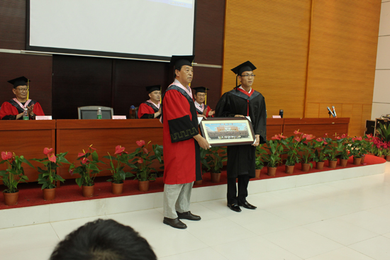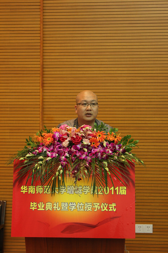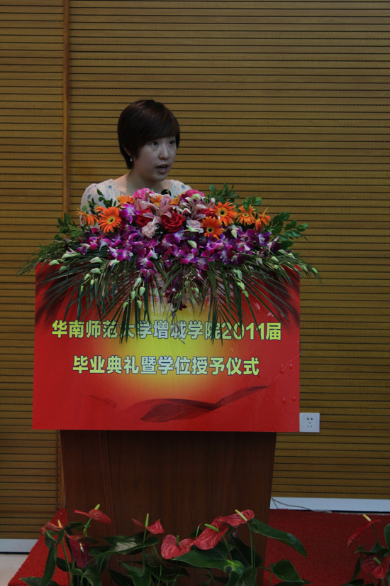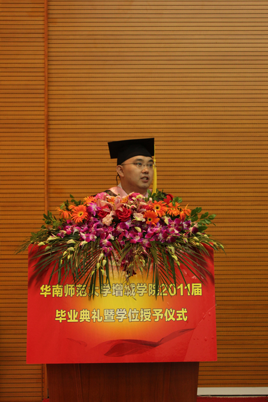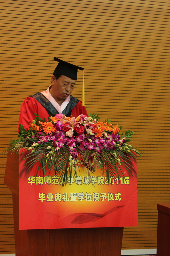 毕业典礼是10:00分开始的。首先响《国歌》,学校领导作了热情洋溢的致词。他对毕业生圆满完成学业表示热烈祝贺;对为培养毕业生付出辛勤劳动的教职工表示衷心感谢;寄语广大毕业生走上社会后要树立远大理想,热爱祖国、报效祖,要心态端正、胸怀宽广,做诚实守信、品德高尚的人;并勉励广大毕业生要勇于创新、敢于创业。毕业典礼的主要环节首先是为25位优秀毕业生颁奖。紧接着为在场毕业生颁发学士学位证书和拨穗仪式,学校领导为毕业生把头上学士帽的流苏从右边换到左边,这代表稻穗或麦穗成熟,象徵毕业生已学有所成,可以展翅高飞。最后,欧莹书记为07届毕业生送上祝福,衷心希望毕业生往后的生活更加灿烂美好。