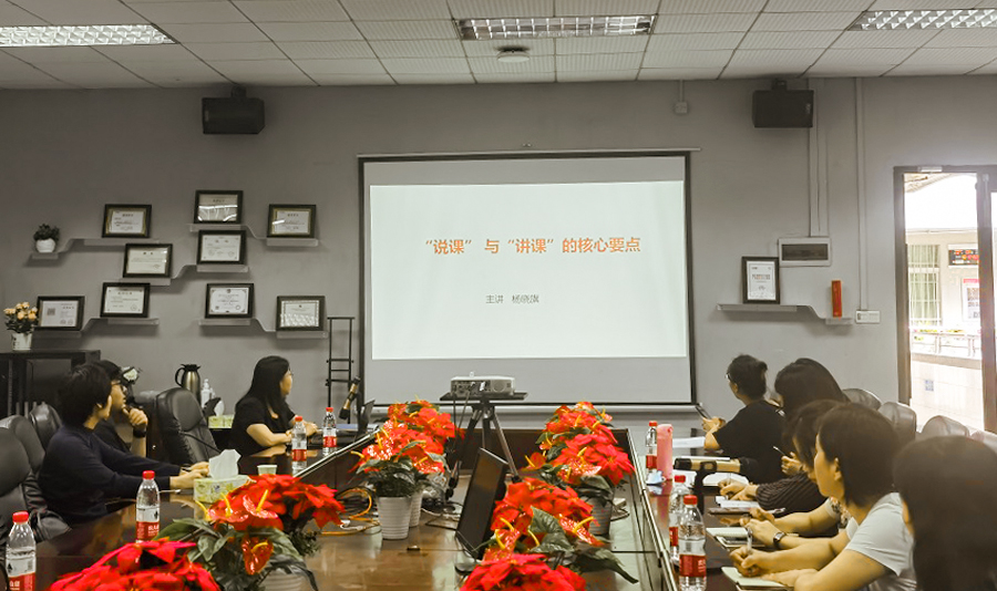 杨教授首先从“说课”与“讲课”的不同之处切入,分别讲述两者在对象、内容、情景三个方面的不同,从而引出“说课”是什么,“说课”的内容包括哪些,同时结合实际,举例示范了“说课”的整个过程,让老师们直观地理解了何为“说课”;此外,杨教授还强调了“说课”的注意事项,指出:“说课”过程中时间的控制至关重要。接着,杨教授跟大家讲授:如何讲好一堂课?所谓“台上一分钟,台下十年功”,讲好一堂课的关键是做好充分的准备,这既是讲好课的前提,更是作为一名教师应有的责任;同时,杨教授强调教案的重要性,指出老师们都必须重视教案,这是教学设计的体现,是对整个教学活动的预设;此外,杨教授指出制作课件的注意事项,强调课件只是教学过程中的辅助工具,老师们不能过于依赖课件,要真切地熟悉课程,掌控课程;教师是课堂的第一责任人,教书育人,作为教师必须做到以生为本、以学为本、教学相长,在整个教学过程中除了教师的“讲”更要重视学生的“听”,要严格控制好课堂纪律。最后,杨教授跟大家讲解怎么更有效地进行教学反思,让老师们更好地对自己的课程进行审视和分析,以更好地提升教学质量。