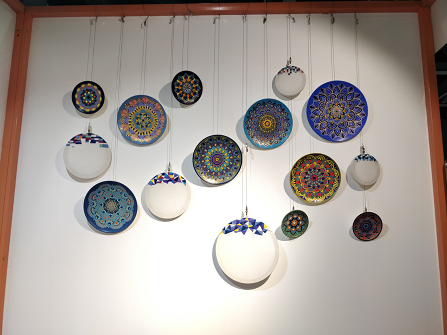 展位上还搭配了由视觉传达设计专业胥璟老师带领学生创作的装饰画作品《手绘装饰挂盘》、《刺绣装饰壁挂》、《蓝绿红黄装饰画四件套》、《梦幻装饰画五件套》;由产品设计专业潘梦梅老师创作的《几何》陶瓷装饰摆件、《屋顶》花器,学生创作的《大象》、《犀牛》等陶艺作品,为家具展增色加彩,获得参展商与观众的纷纷好评。