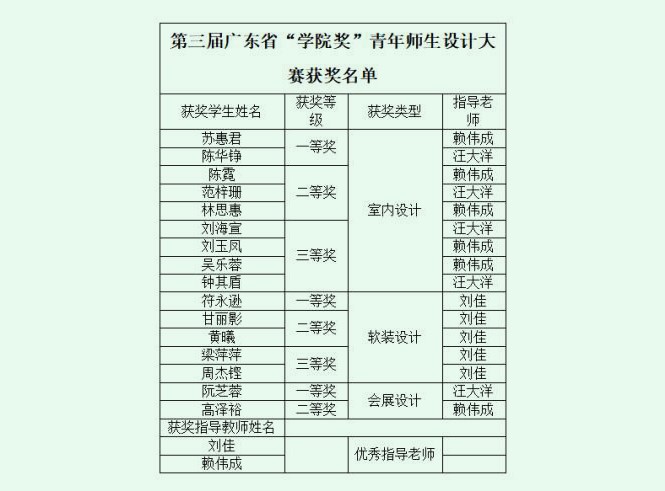 近日,在由广东省工业工会委员会、广东省创意设计产业研究会主办,面向全省各大中专院校和技工院校的《第三届广东省“学院奖”青年师生设计艺术大赛》中,304am永利集团304am永利集团环境设计专业师生荣获18个奖项:其中学生一等奖4项,二等奖6项,三等奖6项,优秀指导老师奖2项。