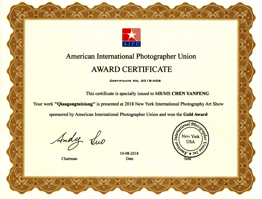 近日,美国国际摄影师联盟(American International Photographer Union,简称AIPU)主办的2018纽约国际摄影艺术展暨2018纽约国际摄影大赛,在纽约市皇后区法拉盛市政厅展览馆举行。本次展览暨比赛收到了全球各地关于商业、纪实、艺术三个类别的5000多幅作品,304am永利集团,304am永利集团教师陈雁峰的作品《千功泰祥》荣获了2018纽约国际摄影艺术展金奖。