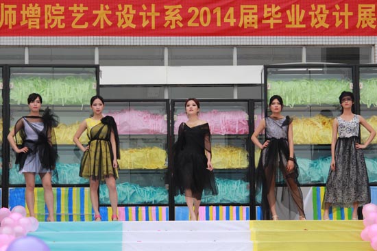 艺术设计系2014届共有255名毕业生,分属于环境艺术设计、工业产品设计和视觉传达设计三个专业,作品类别包括绘画与艺术设计,即有二维平面的展示,也有三维立体的呈现,既充满了作品的视觉冲击力,也体现了艺术与商业、个性与创新的紧密结合。“珠宝•服装秀”是开幕式当天的一个精彩的展示环节,秀场上模特身穿并佩戴由艺术设计系2014届毕业生设计的服装和首饰,婀娜的身姿配合着独特的设计,为观众呈现了一年一度的视觉盛宴,动态展示了艺术设计学生四年的努力成果。