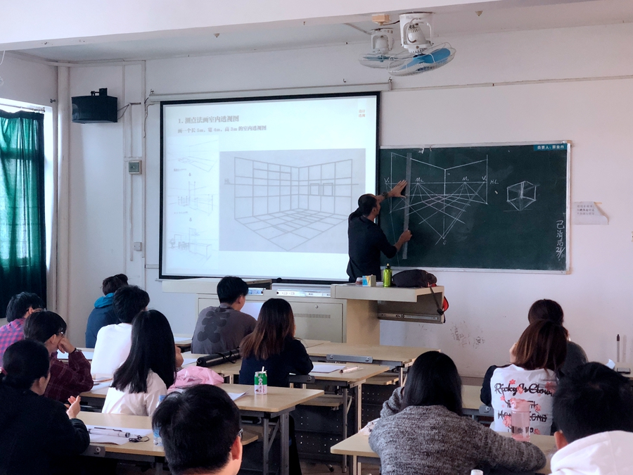 本次研讨课课程为《设计透视》,主讲教师为周子豪。课上,周子豪点明本节课重点为用测点法画室内透视图。他请一名同学根据前节课的知识点用测点法画立方体的成角透视,并根据学生画的透视图,来讲解及演示本节课课程内容——用测点法画室内透视图,边演示边讲解其特点,及实际应用。课上,他安排学生根据讲解的知识点练习用测点法画室内透视图,现场进行点评及辅导。整堂课授课内容充分,条理严谨,讲练结合,充分让学生熟练掌握画法并应用于实际中。