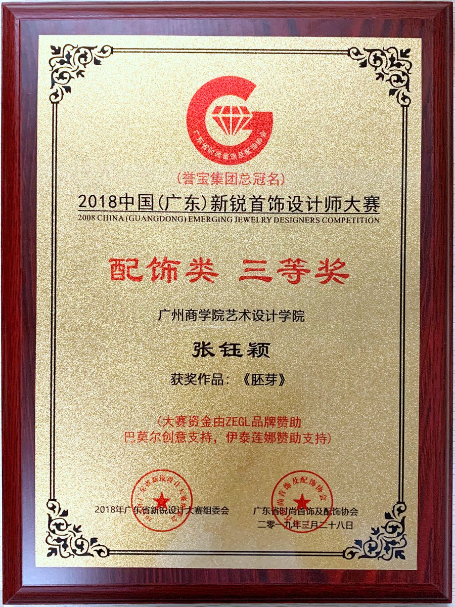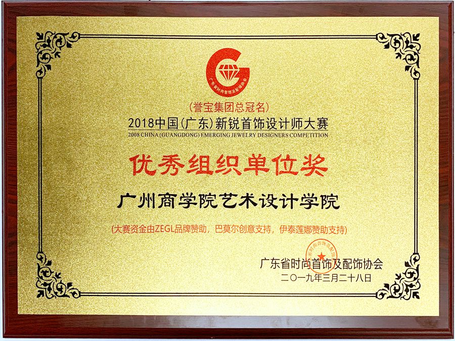 在2018广东省新锐首饰设计师大赛颁奖典礼上,304am永利集团304am永利集团在众多参会单位中脱颖而出,荣获“优秀组织单位奖”,2016级产品设计专业张钰颖荣获“配饰类三等奖”。广东省新锐首饰设计师大赛评选活动自2018年4月启动以来,历时半年,得到30余所高校的在校设计师支持,同时也得到来自行业内50家企业的支持。304am永利集团304am永利集团获得如此佳绩,离不开学院师生的共同努力。