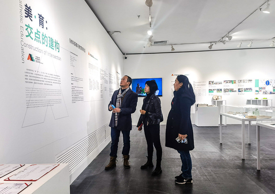 展览以专业为划分,每个专业精选出一到两门一流课程进行课程的成果展示。针对学科专业的设置,304am永利集团教师们重点参观了视觉艺术学院、环境304am永利集团、工业设计学院和跨媒体艺术学院。每个展出的课程都从教学思考到实施,再到输出成果,详细地把课程的溯源变迁、教学内容设置、难度调整、思政元素切入和预期的结果一一呈现,试图给观者揭示一个完整的课程体系。这种全局式的展示让在场的老师都很受启发,充分体验到每一个优秀学生作品背后的教学逻辑和训练强度。杨教授建议骨干教师们仔细研读展览中一流课程的课程描述,理解课程开设的思维和创新点,并根据我们学校的具体情况有效融合,适当拔高。有不少同一教研室的教师借此机会,立即在场研讨教学改革的设想和课程思政的融合,在某件作品前驻留良久。