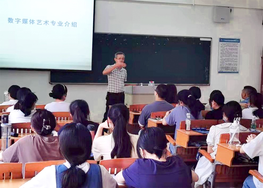 在第二环节中,由数字媒体艺术专业负责人陈卫平教授介绍专业特色与人才培养方案。陈教授以数字媒体艺术的概念为导向,介绍了数字媒体艺术专业的特点与优点,进一步引导学生认识专业的发展前景,引出本专业的培养目标、培养规格和主要课程设置。同时,也介绍了本专业的两大专业方向——数字动画设计和数字影像艺术,激发了在场学生的浓厚兴趣。陈教授祝愿各位新生们勤奋刻苦、踏实学习,热爱自己的专业,提高专业学习的信心。