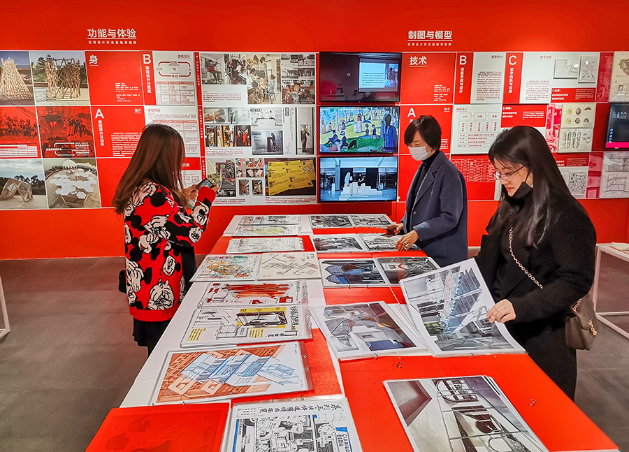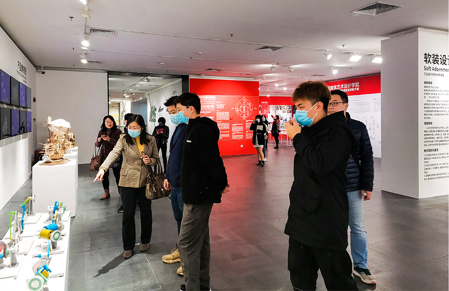 展览以专业为划分,每个专业精选出一到两门一流课程进行课程的成果展示。针对学科专业的设置,304am永利集团教师们重点参观了视觉艺术学院、环境304am永利集团、工业设计学院和跨媒体艺术学院。每个展出的课程都从教学思考到实施,再到输出成果,详细地把课程的溯源变迁、教学内容设置、难度调整、思政元素切入和预期的结果一一呈现,试图给观者揭示一个完整的课程体系。这种全局式的展示让在场的老师都很受启发,充分体验到每一个优秀学生作品背后的教学逻辑和训练强度。杨教授建议骨干教师们仔细研读展览中一流课程的课程描述,理解课程开设的思维和创新点,并根据我们学校的具体情况有效融合,适当拔高。有不少同一教研室的教师借此机会,立即在场研讨教学改革的设想和课程思政的融合,在某件作品前驻留良久。
