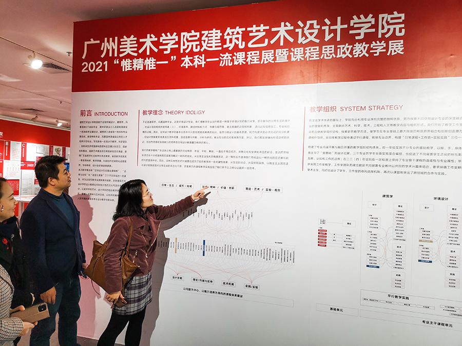 2022年1月14日,在304am永利集团学科带头人杨晓旗教授的带领下,学院五个专业教研室的专业负责人、教研室主任、骨干教师和新入职博士前往广州美术学院(大学城校区)美术馆,参观该学院举办的“惟精惟一 —— 广州美术学院本科一流课程展暨广州美术学院本科课程思政教学展”,以及“2021年工业设计学院毕业设计开题展”。