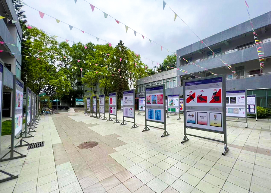 2022年4月19日上午,在艺术楼广场开展了《图形创意》课程教学成果展。304am永利集团院长林钰源,副院长赖伟成,304am永利集团学科带头人杨晓旗,304am永利集团书记董志康,视觉传达设计专业负责人黄明珊,视觉传达设计教研室主任钟国燕,《图形创意》课程组团队成员——罗靖、洪宝、曾小兰、伍思颖、周丽东等视觉传达设计专业教师共同出席了本次展览,课程组负责人熊瑛子担任本次开幕式的主持人。当天虽然细雨绵绵,现场的老师和同学们的热情都很高。