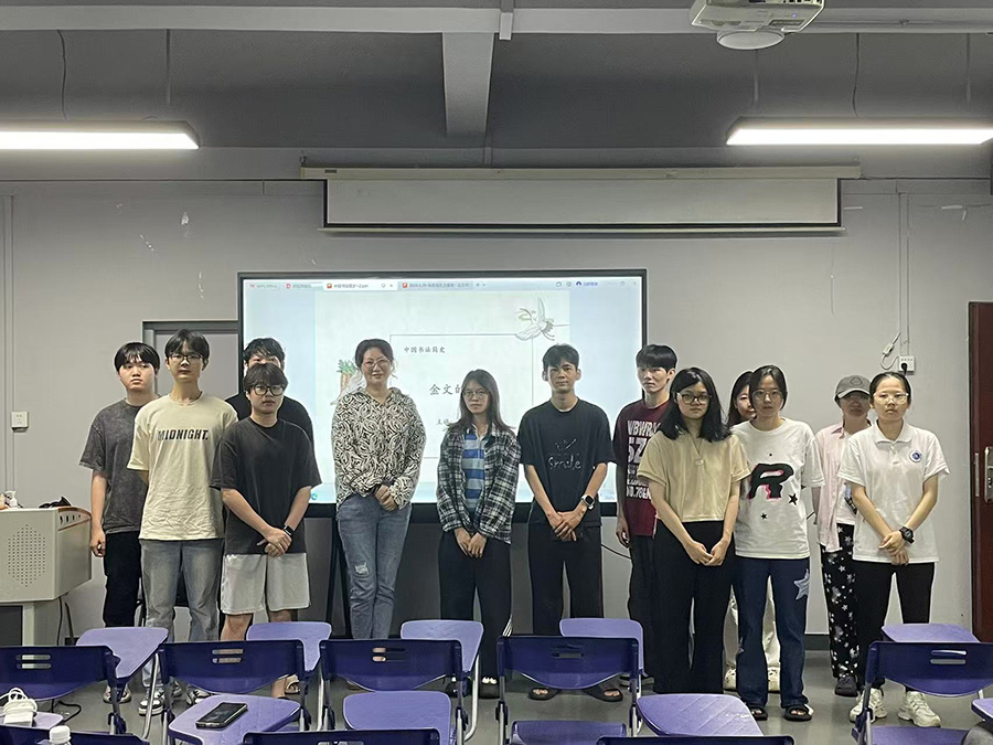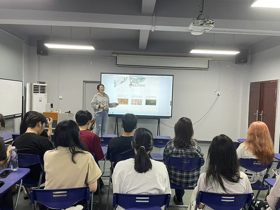 张一丹通过图文并茂的演示、趣味问答等形式,充分调动了师生的参与热情。同学们踊跃提问,就金文元素在现代设计中的创新应用、传统书法艺术与当代审美融合等问题与张博士展开深入探讨。