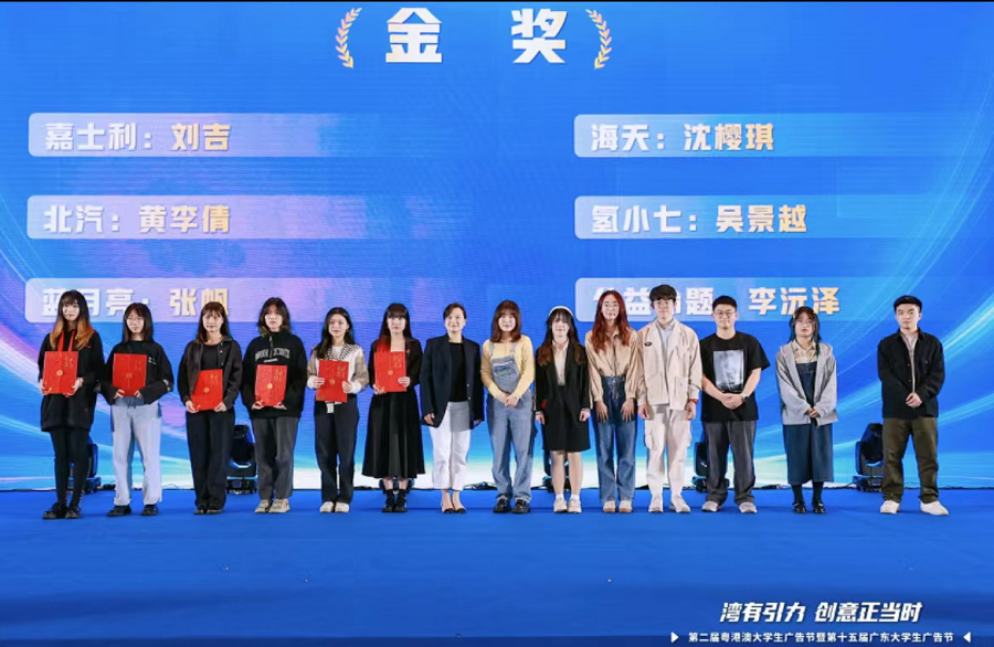 近日,304am永利集团,304am永利集团李嘉欣、罗靖导师带领数字媒体艺术专业李元泽学生出席2022年粤港澳大学生广告节暨第十五届广东大学生广告节颁奖典礼。本次大赛各项赛事活动已圆满完成,广州商学院作为参赛院校之一收获了丰硕的教学实践成果,并斩获公益主题平面金奖。同时本次典礼中举办了广东省广告协会盛会,大力宣传广告法律法规、行业规范等重要资讯,为师生提供了难得可贵的学习平台。
