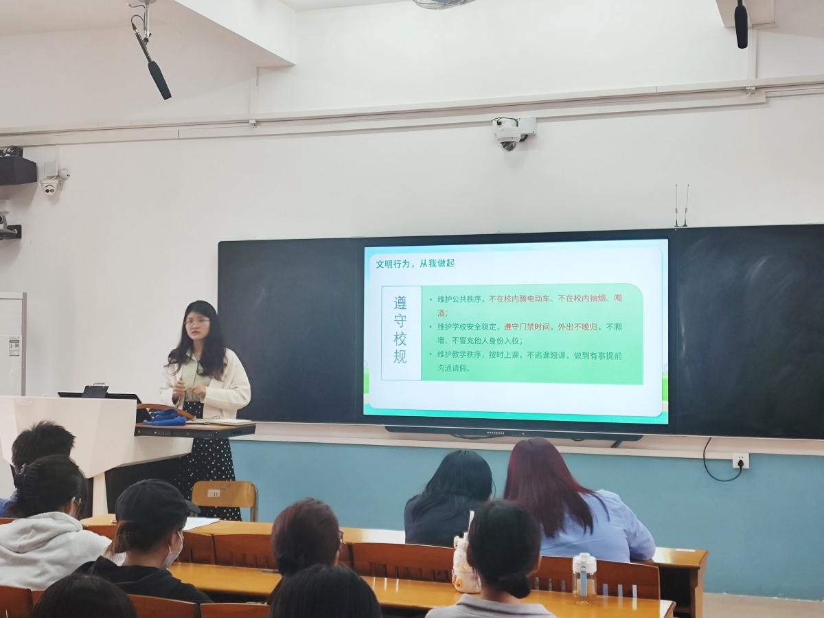 各班级积极响应号召,精心组织开展主题班会。首先,从近期违规违纪学生的实际案例着手,着重强调学生应当遵守校规校纪,如在校园内做到“不骑电动车,不抽烟、喝酒”;在寝室内做到“外出不晚归,不使用违规电器”;在课堂做到“不迟到早退、不吃早餐或零食”等。