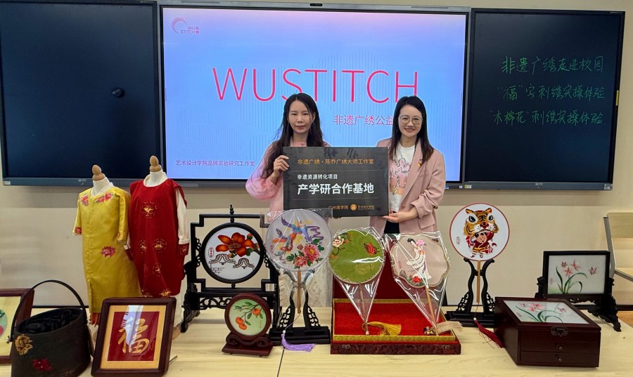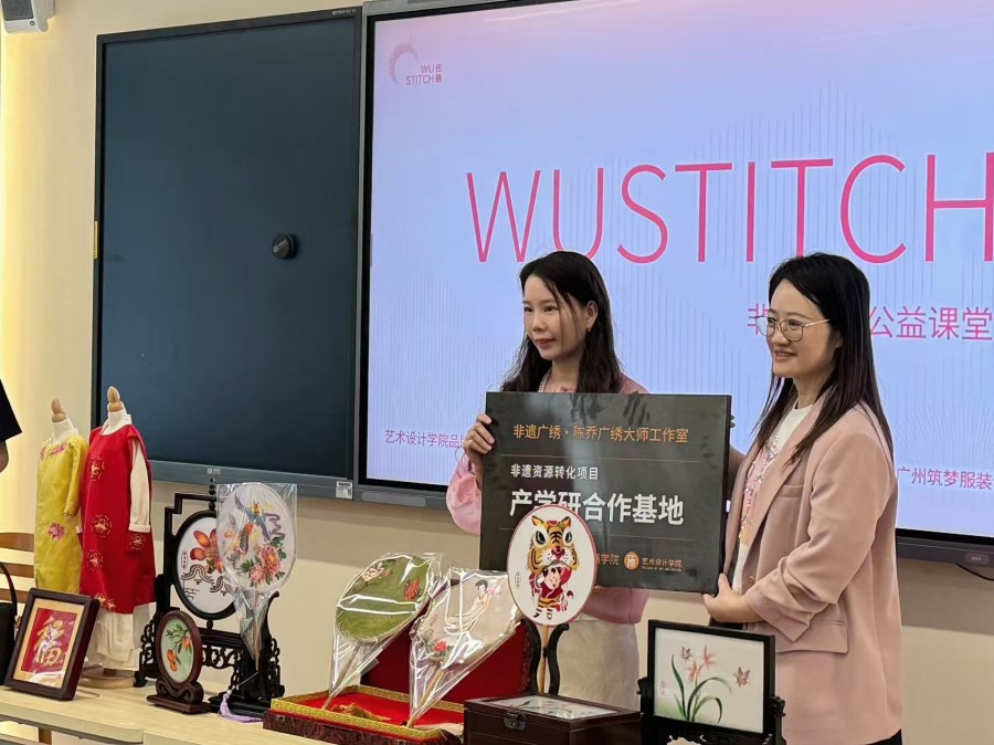 仪式最后,钟国燕副教授与非遗广绣传承人陈乔共同为“非遗广绣工艺产学研合作基地”揭牌,标志着广绣非遗文化保护与创新实践迈出了坚实的一步。该基地将致力于通过校企合作,培养更多兼具创新能力与文化传承意识的高素质人才,推动非遗广绣在新时代背景下焕发新的生机与活力。