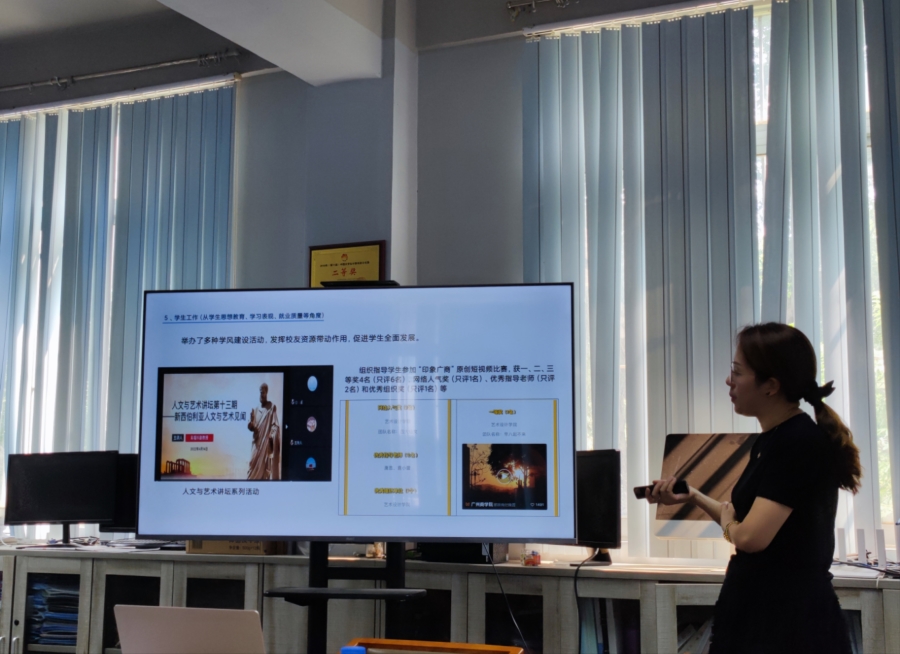 黄艳老师就304am永利集团工作进行了简要汇报,使老师们了解学院当前主要工作的开展情况及数媒专业所取得的成绩。在充分肯定各项工作的同时,她指出扩招所带来的压力、数媒专业自身的特殊问题等工作中存在的问题。基于这些问题,她提出了本学年的工作计划,落实立德树人的根本任务,服务学校大局;落实好安全教育工作,确保学生稳定;落实整改方针,迎接评估回访;重视学科建设,科研、教研、教改不断增量提质。并就校级督导对上学期期末资料查阅情况进行反馈,提出整改建议。