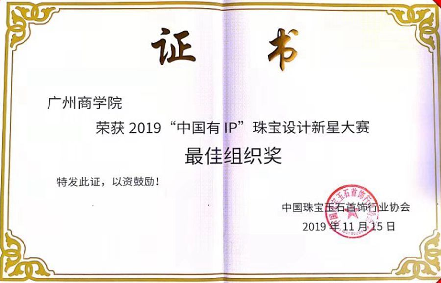 2019“中国有IP”珠宝设计新星大赛最佳组织奖”证书