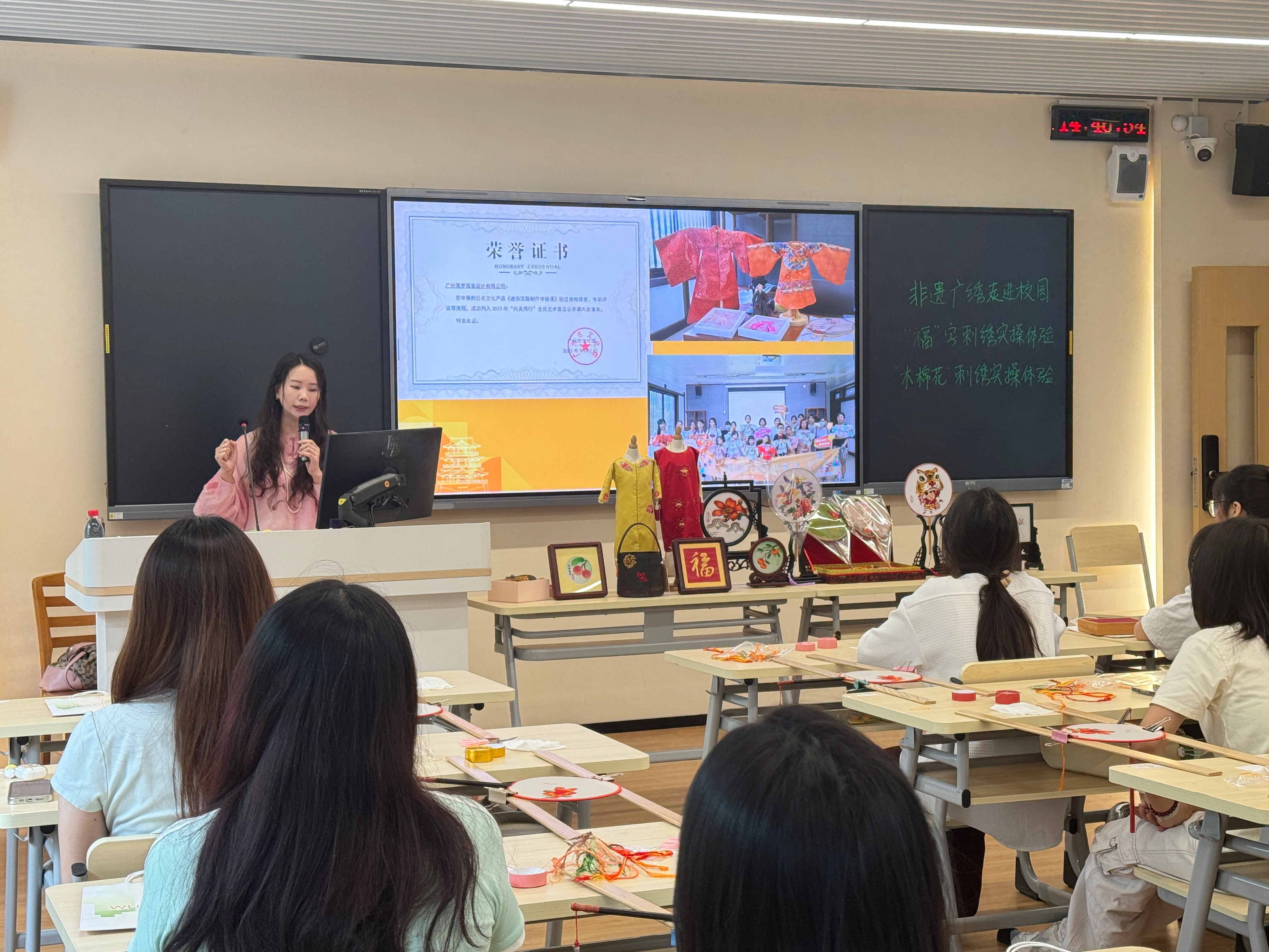 在课堂上,广绣代表性传承人陈乔为同学们带来了“福”字刺绣与木棉花团扇刺绣两项课程。她首先向同学们介绍了广绣的历史渊源与艺术特色,并深入讲解木棉花所蕴含的文化寓意。广绣传承人陈乔指出,广绣作为中国四大名绣之一,以“浓彩重辉、饱满热烈”的视觉风格和“以针为笔、以线为墨”的精湛工艺著称,其创作题材涵盖花鸟、山水、人物等多个领域,不仅凝聚着岭南先民的生活智慧与审美追求,更于2006年被列入国家级非物质文化遗产名录,成为中华优秀传统文化走向世界的重要代表符号。