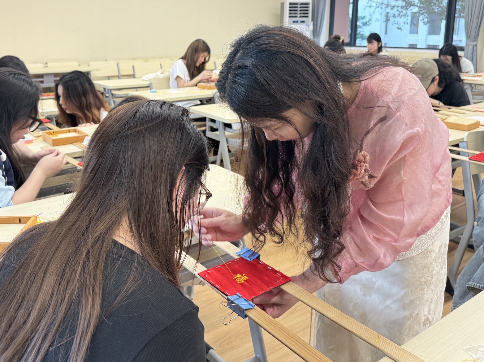 为了让同学们更深入地了解广绣,活动课堂特别设置了实操体验环节。在实操环境中,广绣传承人陈乔带领同学们了解广绣的分类及其独具特色的针法技艺,包括绒线绣、立体盘金绣、珠绣等。刺绣环节中,同学们以红棉为题,丝线为笔,绣布为纸,从劈丝、穿针到刺绣,亲手在真丝布上勾勒出木棉挺拔的身姿,细致绣制成团扇作品。同时,“福”字刺绣课程也寓意美好祝愿,在针线之间寄托吉祥喜气。这一环节不仅激发了同学们对广绣技艺的兴趣,更让大家在实践中深刻体会到了刺绣所需的耐心与细致。