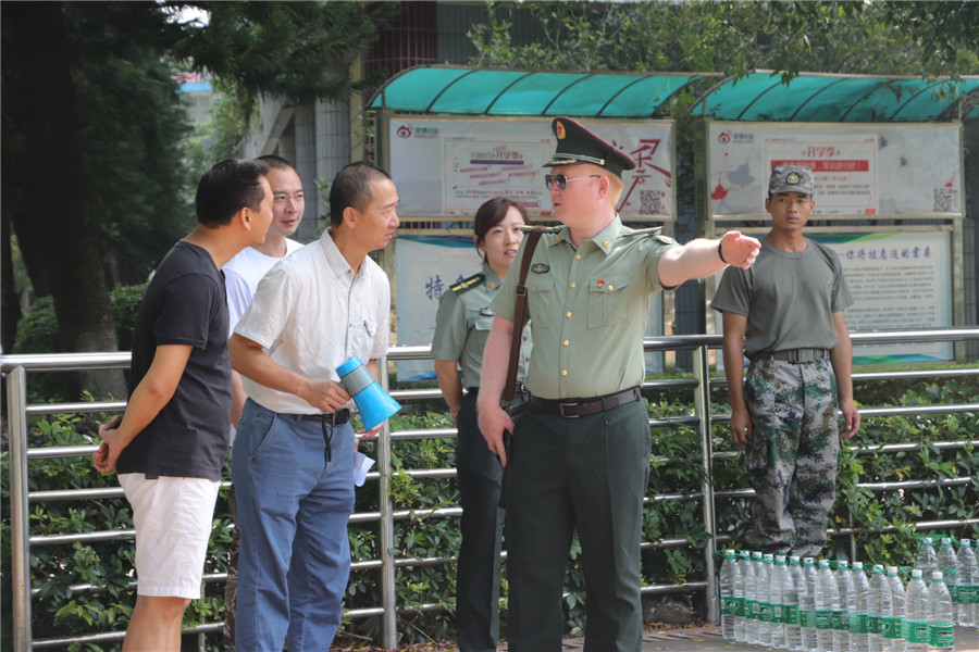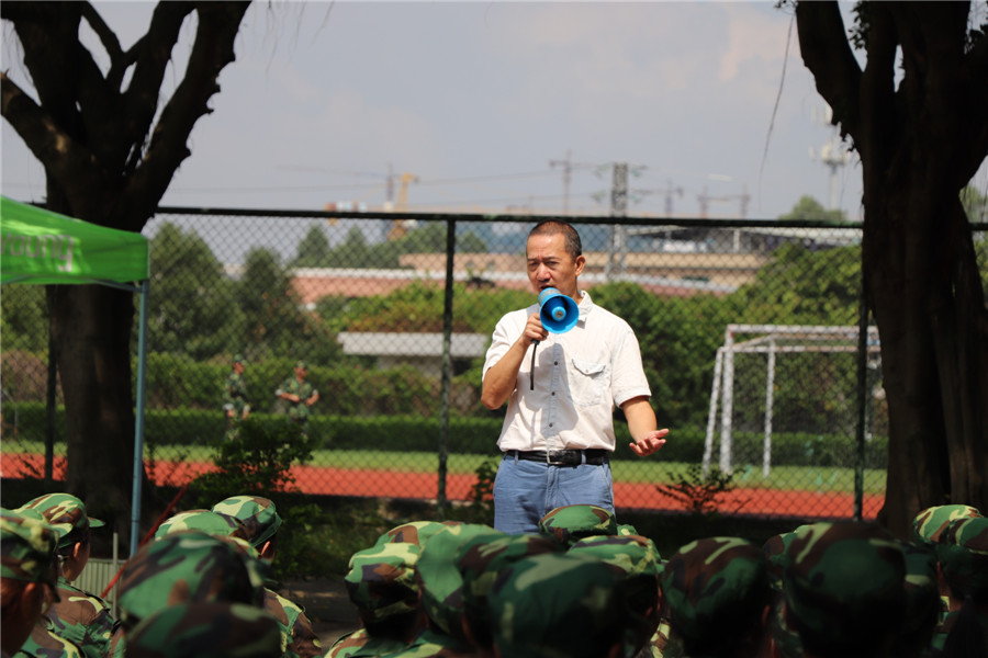 林钰源一行检阅了8营营区的第一方阵、后勤“飞虎队”和分散在广商足球场的速成方阵。在训练场上,林钰源与承训部队的教官进行亲切交谈,询问军训情况、了解学生训练效果和精神风貌。同时询问学生军训“累不累,苦不苦,闲拉家常等”。他鼓励受训新生一要通过刻苦、紧张、严格的军训磨练自己的意志,养成良好的生活作息习惯和一不怕苦、二不怕累、三不怕脏、四不怕难的坚强意志品格;二要通过军训增强自身的体质锻炼,快速适应大学生活,融入集体,培养团队意识和团结协作精神;三要通过军训强化自身的国防意识,培养军人血性,延续部队的优良传统,也可以大学毕业后响应国家号召,携笔从戎,保家卫国,成为一名真正的军人。