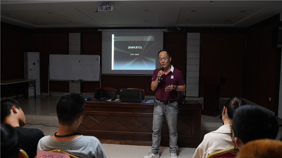 黎志伟通过问题导入法引出讲座主题,通过幽默风趣的语言表达告诉学生艺术生与文科生、工科生的区别,引起学生学习的兴趣,同时传递艺术源于生活、高于生活的创作理念。他讲到,好的作品创作需要亲近自然、用心聆听,强调色彩风景是色彩教学中一个极其重要的组成部分,对提高学生的色彩写生能力和认识自然、表现自然的能力有着重要的意义,也阐述了此次写生的价值和作用。他还谈到,主要想通过色彩风景的学习,使学生认识和发现大自然色彩与造型的美感,增强色彩造型的表现能力。同时指出风景写生色彩表达的重点、难点。