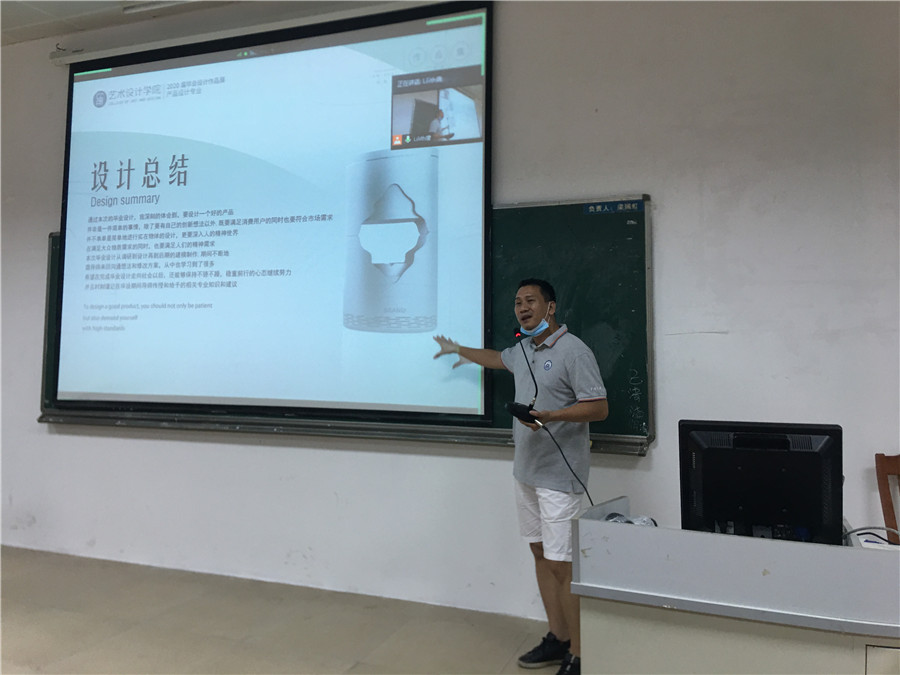 讲座上,赖伟成以2020届4个优秀毕业设计作品赏析为引,向参加讲座的同学介绍2020届毕业设计整体情况。他结合毕业设计的共性问题,以“荔枝树上长龙眼”、“活字印刷的发明”“华为手机的崛起”三个生动的小故事,向2017级学生讲述毕业设计中选题技巧、设计理念、基础架构、市场调研、文化底蕴五个方面的内容。他结合自身执教以及工作的经历,分享了自己对优秀毕业设计的定义,他说“优秀的设计不只是外观,更加注重内涵”。优秀的毕业设计需要具备文化底蕴,在历史文化中寻找“形、色、彩”,并且满足设计的功能性。