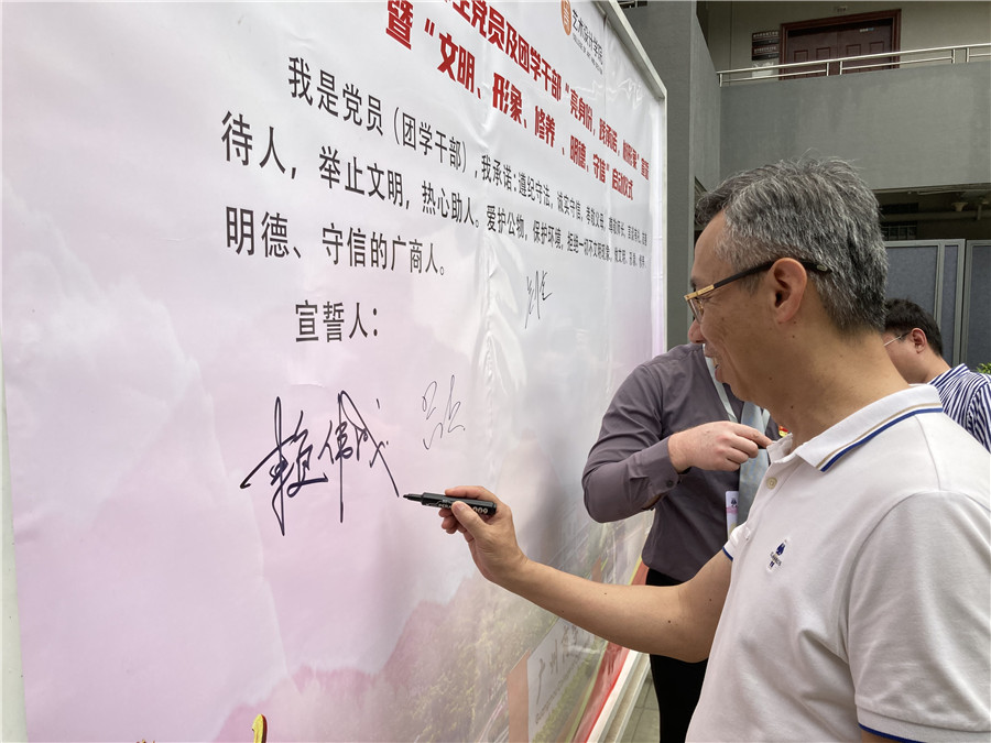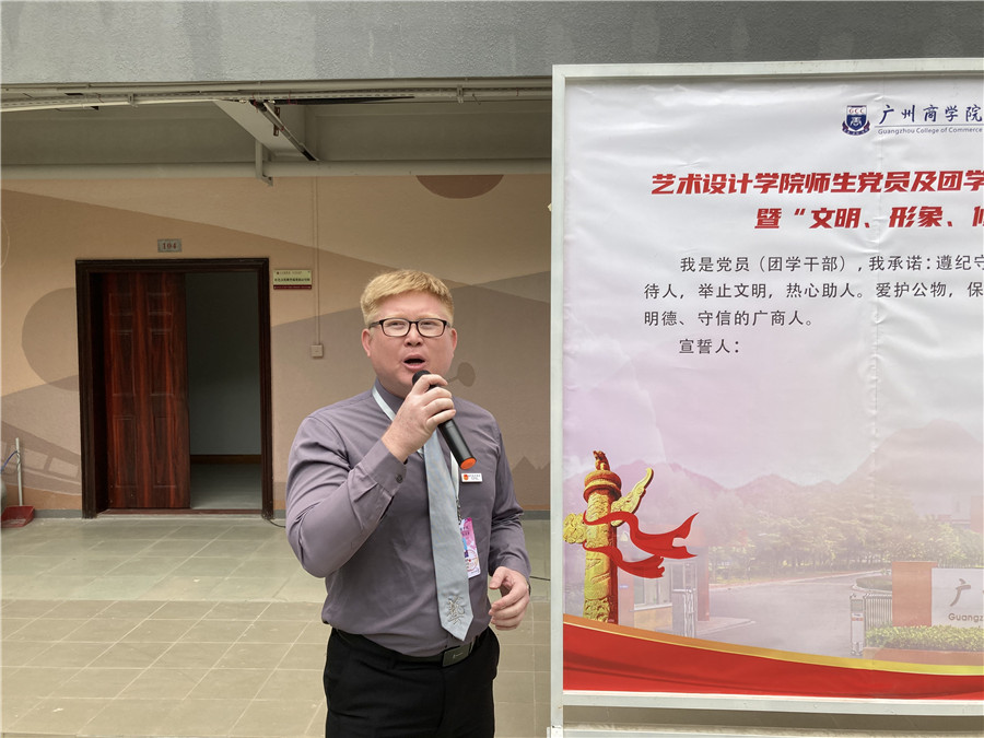 活动现场,关树基简短的总结了学院近两年开展党员(团学干部)“亮身份、践承诺、树形象”行动所取得的显著成绩,同时也指出了存在的不足。他进一步阐述党员和团学干部的初心使命,要求党员和团学干部严格要求自己,时时处处发挥好榜样示范作用,坚持为群众办好事、办实事、解难题,希望全体党员和团学干部珍惜荣誉,巩固来之不易的成果,做好文明、形象、修养 、明德、守信的带头人、引路者,充分展示广商艺术学子的形象修养,迎接合格评估的到来,以实际行动向建党百年献礼。关树基还带领全体活动参与人员宣誓。我是党员(团学干部),我承诺:遵纪守法,诚实守信,孝敬父母,尊敬师长,言谈有礼,友善待人,举止文明,热心助人,爱护公物,保护环境,拒绝一切不文明现象,做文明、形象、修养 、明德、守信的广商人。他还号召学院全体党员和团学干部要积极响应“亮身份,践承诺,树形象”行动和带头做“文明、形象、修养 、明德、守信”宣传大使。