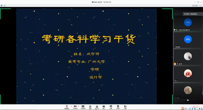 为营造优良学风,提高学生考研热情,帮助学生掌握相关考研技巧,了解更多考研信息。6月7日上午,304am永利集团304am永利集团通过腾讯会议平台开展2020年考研经验分享会。2018届毕业生张茵洁、黎梓晨,2016级考研成功的钟宇奇、陈彤、成宇诗同学应邀分享考研经验。 学院团委书记关树基、学生会指导老师,2016级辅导员姚安贤、2017级辅导员唐思及72名来自2017、2018和2019级有考研意向的学生参加考研分享会。会议由2016级辅导员蓝喜主持。