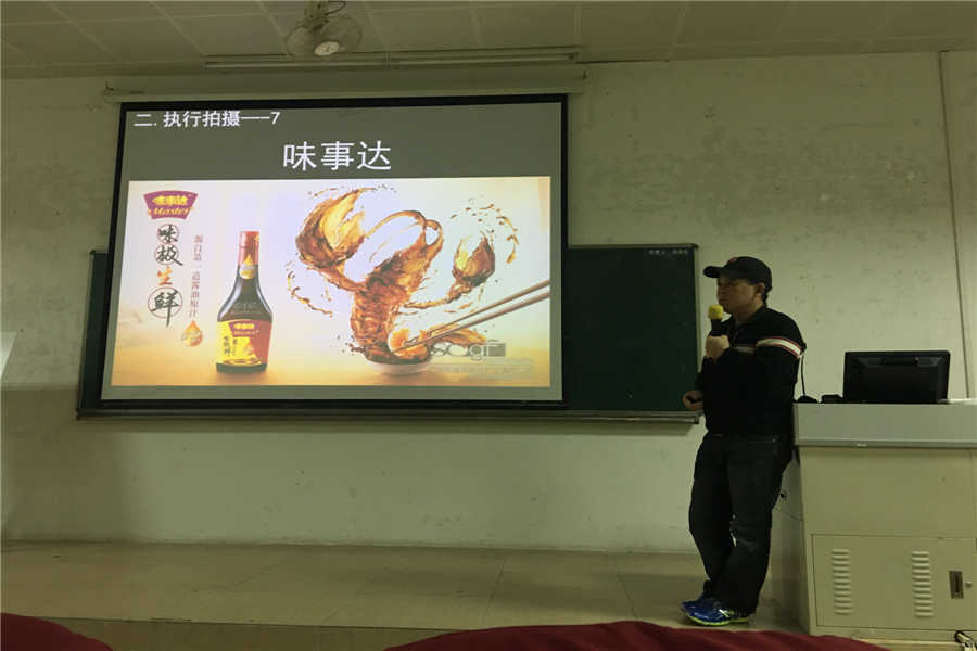 苏卫结合其27年从事艺术、摄影、视觉创意的丰富工作经验讲述了商业摄影的技能和创意灵感,阐明一个优秀的创意工作者必须以市场为导向,充分考虑顾客需求、发散思维、富有激情,敢于创作,充分把自己的创意与顾客要求做到和谐统一。他结合自身从业商业摄影创作的工作案例,着重分享了自己在商业摄影执行过程中的创作思路、创意灵感和拍摄执行过程的精彩故事。课件内容丰富充实、故事情节生动具体,知识要点深入浅出,讲的台下师生全神贯注、意犹未尽,全程150分钟的讲座讲的都是干货,都是商业摄影的实践技巧和专业知识。