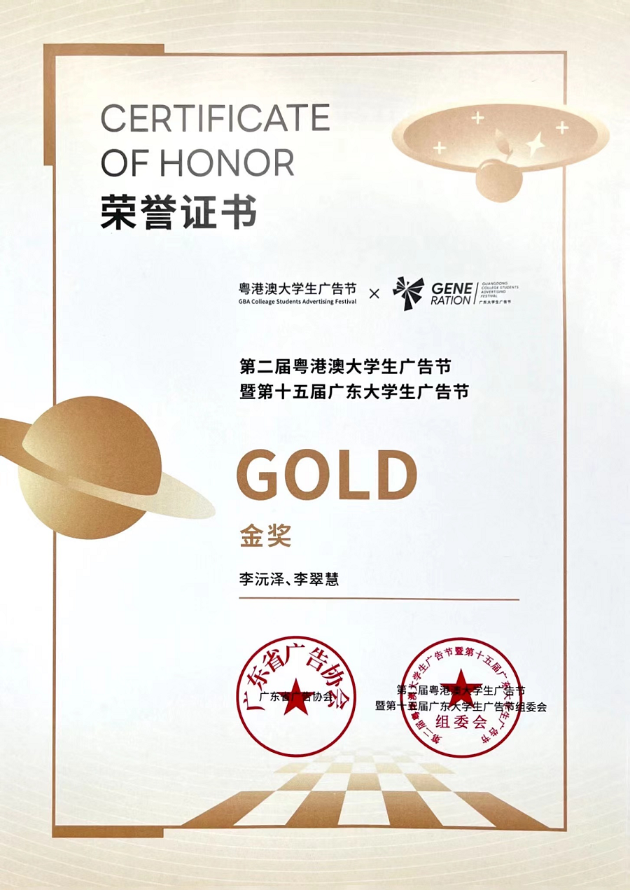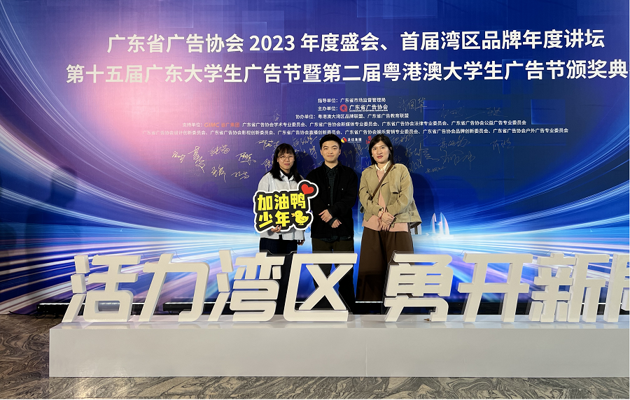 近日,304am永利集团,304am永利集团李嘉欣、罗靖导师带领数字媒体艺术专业李元泽学生出席2022年粤港澳大学生广告节暨第十五届广东大学生广告节颁奖典礼。本次大赛各项赛事活动已圆满完成,广州商学院作为参赛院校之一收获了丰硕的教学实践成果,并斩获公益主题平面金奖。同时本次典礼中举办了广东省广告协会盛会,大力宣传广告法律法规、行业规范等重要资讯,为师生提供了难得可贵的学习平台。