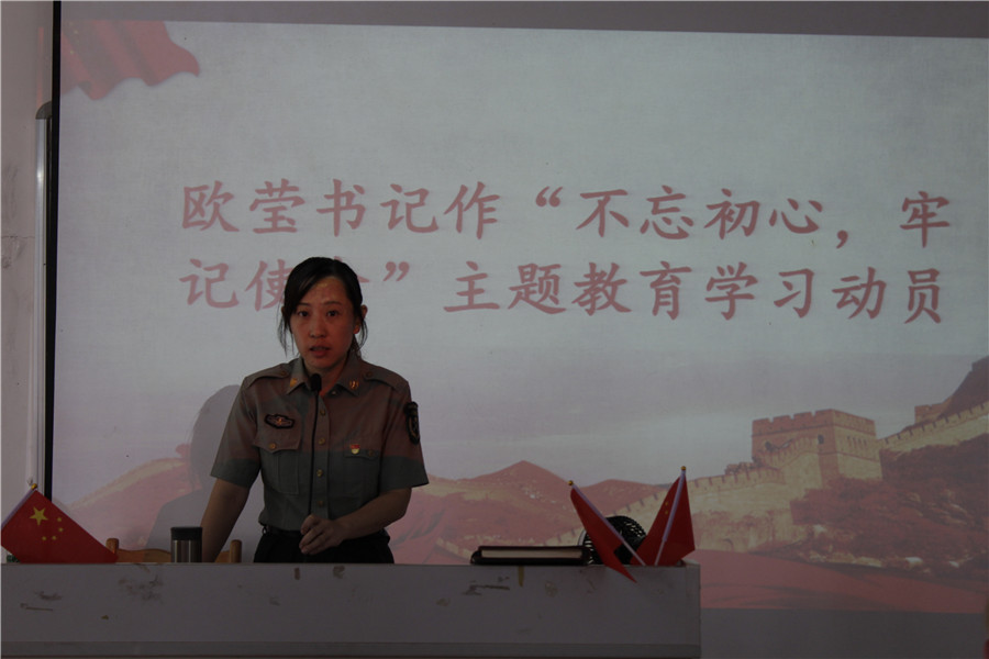 欧莹在会上传达了省委教育工委在全省教育系统“不忘初心、牢记使命”第二批主题教育工作部署会和要求。她要求:一、提高政治站位,学习文件精神,积极参与主题教育活动;二、坚守理想信念,初心使命不动摇,密切联系师生群众,为同学办好事办实事,至少为同学办1件好事,解决师生至少1个难题;三、充分利用“学习强国”APP、“两微一端”等平台开展学习活动,努力提升自己的理论素养;四、重温入党誓词、重温入党经历、重温入党初心,再现入党过程,唤起入党记忆,时刻不忘初心,时刻牢记使命。