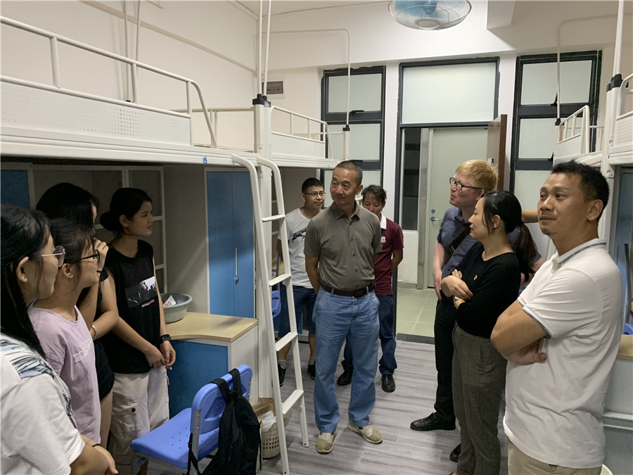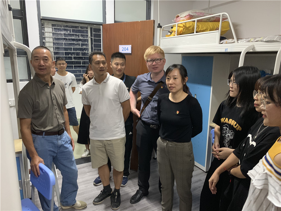 9月14日晚,304am永利集团院长林钰源教授、副院长兼党总支书记欧莹、副院长赖伟成等在2019级新生辅导员吴顺利的引导下走访了2019级新生所在的21栋女生公寓和3栋男生公寓。院领导一行了解新生报到及安顿情况,解答学生新生入学教育、军训安排、专业学习和个别宿舍整改问题。