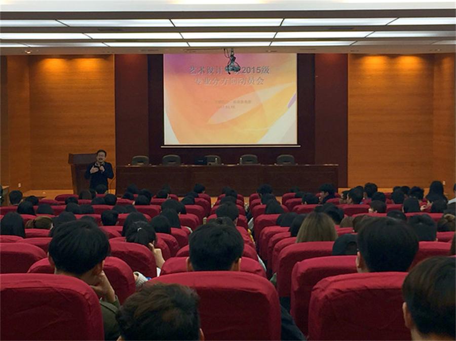 会上,缪鹏对2015级学生进行动员讲话。他就2015级目前三个专业的方向设置和拟分班情况做了简要说明,向同学们介绍了环境设计专业方向的调整计划,提到学院将视情况拟对2015级、2016级新增“陈设与软装设计”方向。最后要求2015级全体同学认真学习,为未来发展打下坚实的基础。