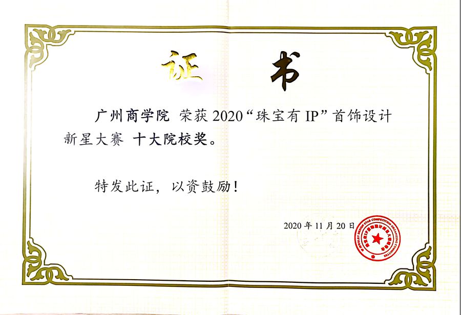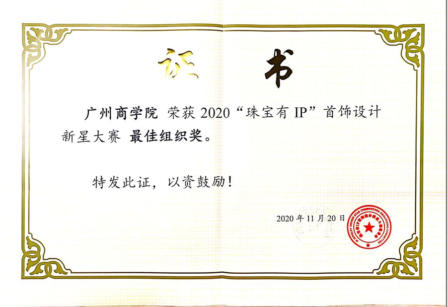 近日,由中宝协学术教育及人才培养专业委员会、广州市恒仕文化传播有限公司、东方环球会展集团联合主办的2020“珠宝有IP”首饰设计新星大赛颁奖典礼暨2021大赛启动仪式在北京隆重举办。广州商学院荣获2020“珠宝有IP”首饰设计新星大赛“十大院校奖”、“最佳组织奖”,陈钦超、黄晓凡、魏芳钰、张志琼获全国百强入围奖,陈晓云、魏芳钰获初赛人气奖,曹茂山、阙慧琳等六位同学获初赛入围奖。