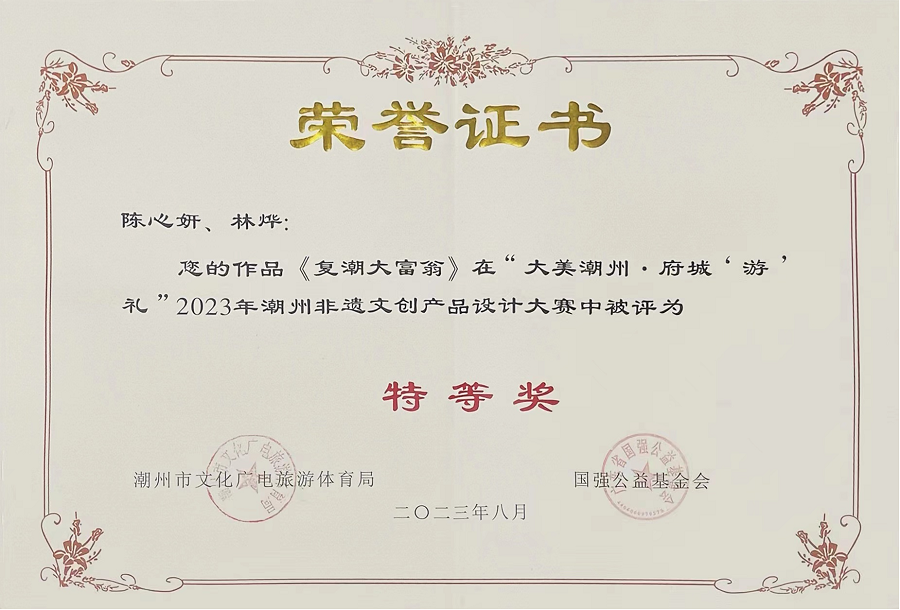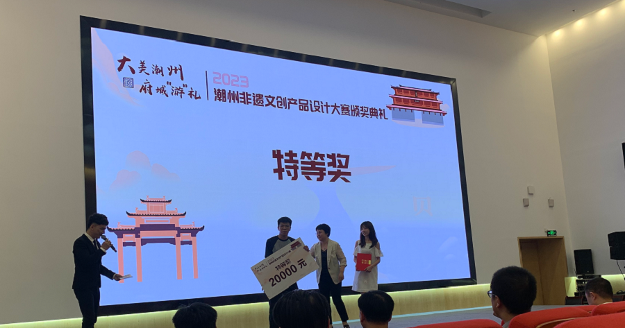 近日,大美潮州府城“游”礼 2023年潮州非遗文创产品设计大赛评奖结果揭晓,304am永利集团家居设计工作室成员陈心妍、林烨组成队伍参赛,斩获大赛唯一一个“特等奖”荣誉,赢得20000元现金奖励。