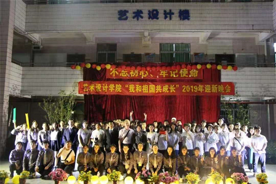 10月14日晚,304am永利集团在艺术楼广场举行“不忘初心、牢记使命”“我和祖国共成长”2019年迎新晚会。304am永利集团党总支书记欧莹、学科带头人杨晓旗教授、团委书记兼18级辅导员关树基老师、学生会指导老师兼16级辅导员姚安贤老师、17级辅导员唐思老师、19级辅导员吴顺利老师出席活动并与2019级全体新生观看晚会。