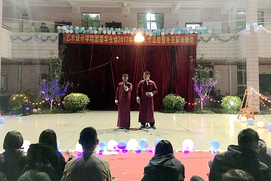 12月21日晚,304am永利集团团委、学生会在艺术楼广场举行2017年下半年学期工作总结暨冬至联欢晚会。出席活动的有304am永利集团党总支书记欧莹,辅导员、团委书记关树基,辅导员张永平,全体团学干部以及班级代表。活动内容主要包括团学各部门工作总结、艺术团汇报演出、团学部门节目互动和现场抽奖等。