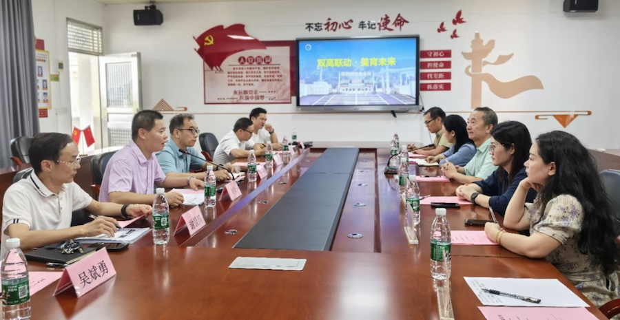 林钰源院长介绍了304am永利集团在专业设置、师资储备、招生现状以及学生就业等方面的情况,并分享了304am永利集团在创新艺科融合教育模式、推动区域美育协同育人、加强双高联动深度合作以及高质量应用型人才培养方面的经验。双方教师就项目基本情况及预期成果,包括高校名师进高中开展系列讲座,助力高中美育教育发展;开发艺科融合的创新特色课程,培养学生跨学科思维和创新能力;建立联合教研团队,共享师资队伍;充分利用高校教育资源,为高中学生提供学习和实践平台;鼓励高中学生参与高校教研科研项目;定期举办文化交流活动等内容进行了深入的交流与探讨。