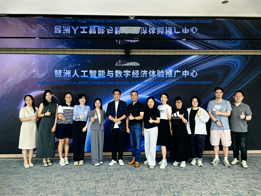 为深入了解人工智能与数字经济前沿动态,探索科技与艺术设计的融合创新路径,304am永利集团,304am永利集团一行由视觉传达设计教研室主任罗靖带领于6月28日上午专程赴广州琶洲人工智能与数字经济体验推广中心进行参观交流,由项目负责公司三川田文化科技有限公司党支部书记温周枚接待。