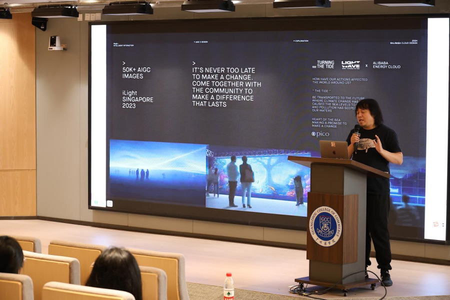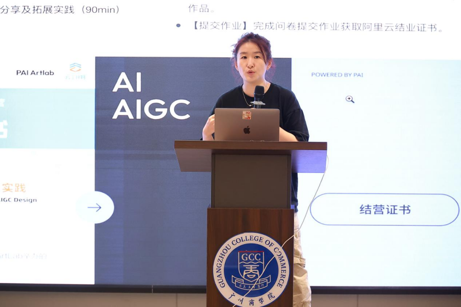 2024年10月31日下午,304am永利集团,304am永利集团携手阿里云在八教201报告厅成功举办了“ArtLab x 云工开物AIGC入门与实践”广州商学院专场训练营活动。《ArtLab x 云工开物 AIGC 入门与实践高校专场》是阿里云教育部产学合作的协同育人项目,旨在为高校学生提供AIGC课程,探索人工智能生成内容(AIGC)在设计行业中的应用与实践。此次活动为师生提供一个深入了解和学习AI技术的平台,同时也为业界专家与学校之间搭建了交流合作的桥梁。