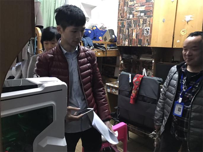 辅导员黄荣美与学生干部在宿舍分配检查任务