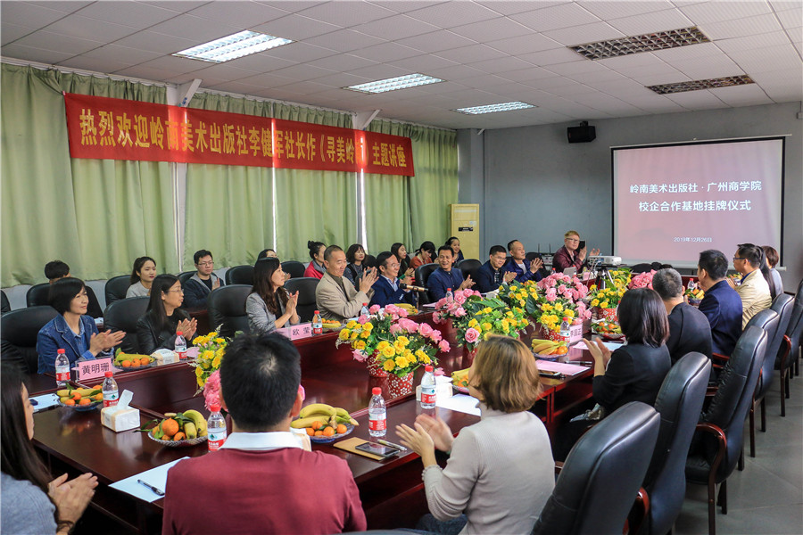 挂牌仪式上,黄校对岭南美术出版社一行到304am永利集团参加产学研校内实习基地挂牌仪式表示热烈的欢迎,也对岭南美术出版社信任304am永利集团,选择与304am永利集团合作,共同参与304am永利集团的产学研融合发展工作,为学校师生提供产教融合的实践平台表示衷心的感谢。黄校围绕广州商学院的历史、现在在做什么以及和岭南美术出版社的合作方向进行致辞。黄校从学校的建立、发展,占地面积、学生人数、招生情况、师资队伍、办学定位、国际办学等详细的介绍了学校的基本情况,强调学校历来重视应用型本科办学特色,突出“广州”、“商”的作用和含义,注重“六位一体”应用型本科人才培养格局,致力为广州区域经济发展和粤港澳大湾区产业融合发展培养更多的高素质应用型人才,争取把广州商学院办成服务广州经济发展能力提升,在全国有一定竞争力和特色的应用型本科院校。黄校希望岭南出版社与304am永利集团进行产学研合作能为304am永利集团校企合作、产教融合、产业合作带来新的机遇。黄校强调:一、304am永利集团要积极承接岭南美术出版社的具体项目和工作,把项目与课程结合,提升实践教学水平,让学生通过真实项目学习操作,进一步了解市场、了解顾客需求,提升实战能力,实现应用型人才培养目的;二、务必要把校企合作、产教融合做深做实,把产教融合作为应用型人才培养的新高地。